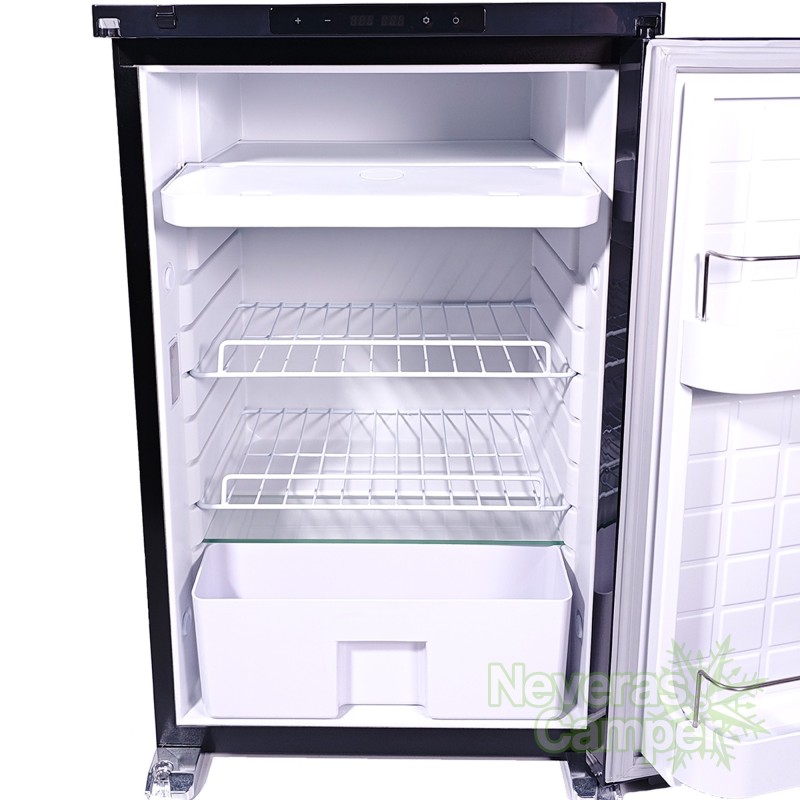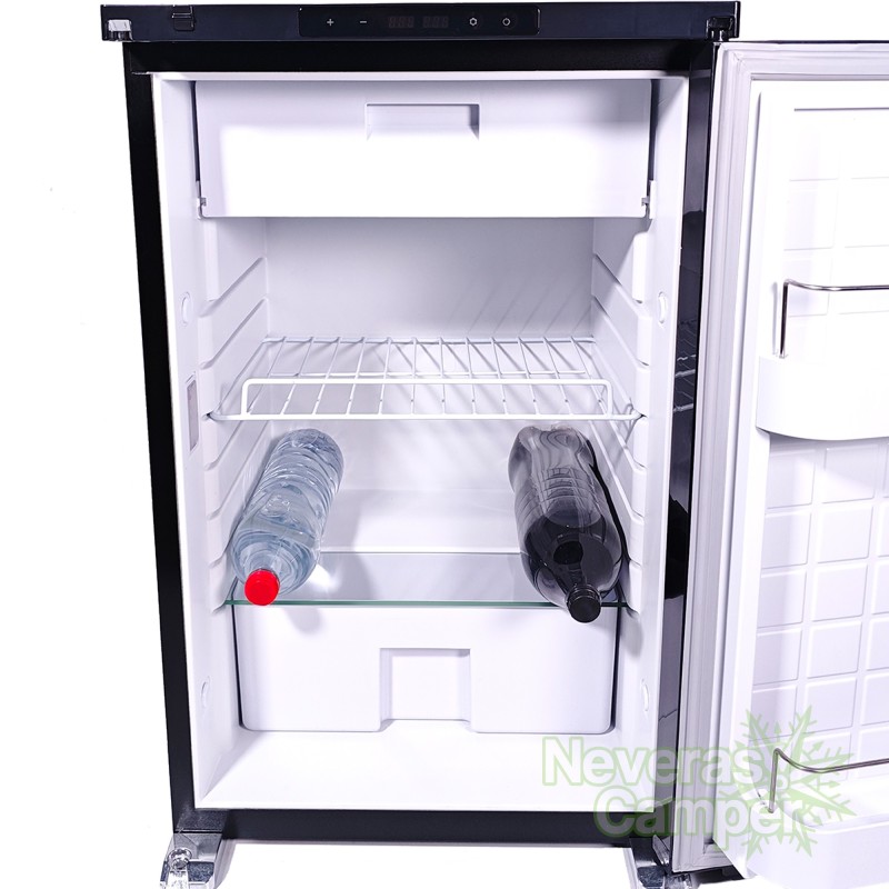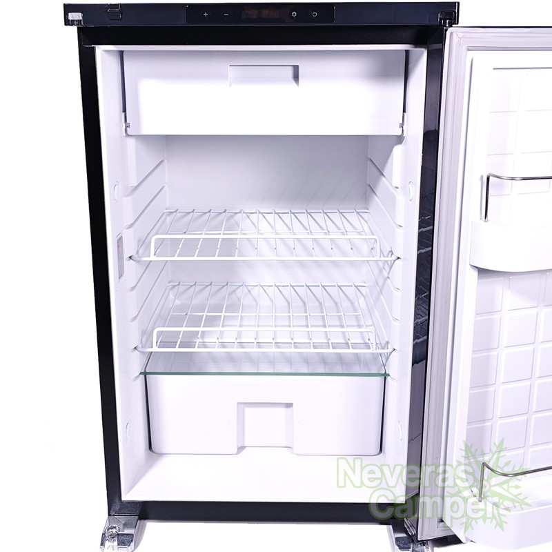 Coolzone R85S es una nevera de compresor de la marca LG con 85 litros de capacidad interior, con una muy buena eficiencia, ideal para furgonetas camper, caravanas y autocaravanas. Funciona a 12V y 24V, e incluye congelador independiente, pantalla LED, puerta con doble apertura y un sistema de protección de batería de tres niveles. Silenciosa, con estantes organizadores y portabotellas, ofrece un excelente rendimiento incluso en temperaturas extremas.
