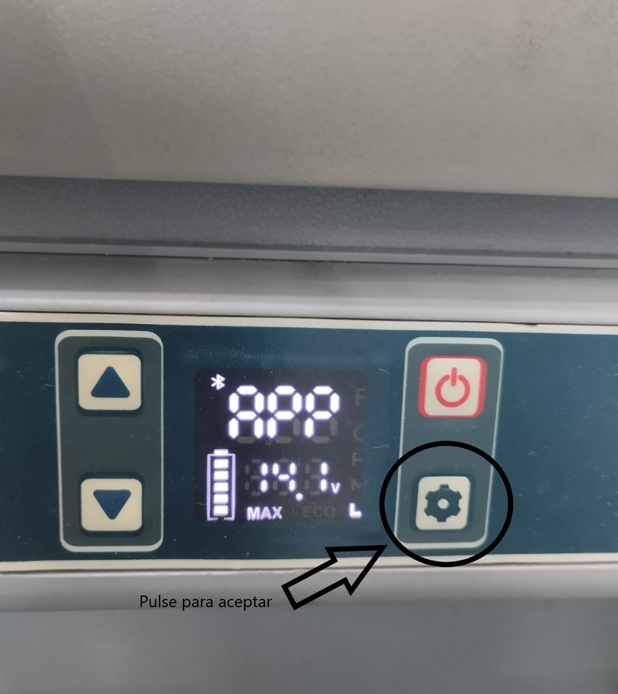 Una vez tengamos nuestra nevera seleccionada tendremos que ir a la nevera y veremos en la pantalla el símbolo APP. Para vincular con la nevera pulsaremos el botón de ajustes que adjuntamos en la foto.