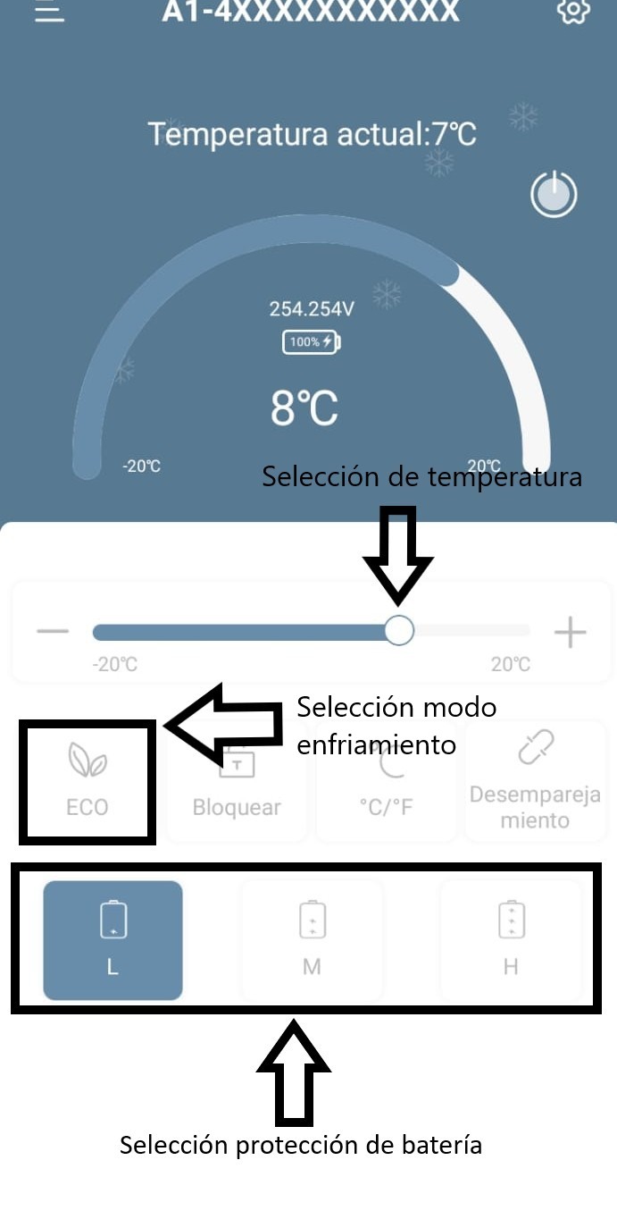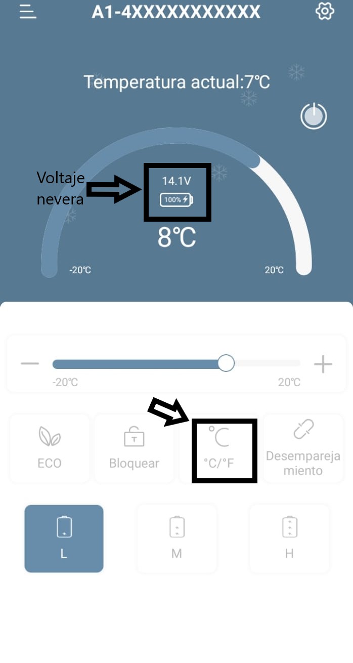 En la parte superior de esta app también podrá ver el voltaje que le esta llegando a la nevera. También podrás seleccionar la unidad de en medida entre grados Celsius y Fahrenheit.